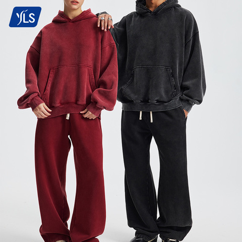 YLSD061 400GSM القطن بولي صوفية بذلة رياضية حمض غسلها الوزن الثقيل فارغة 2 قطعة الخريف هوديس اقتصاص مجموعة