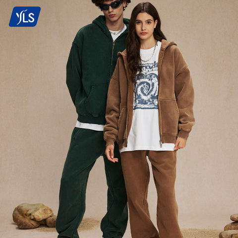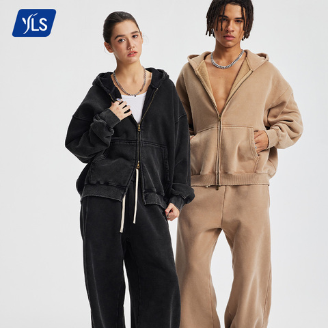 YLS5070 بالجملة بذلة رياضية فضفاضة تناسب Boxy تناسب غسل المتعثرة فارغة سحاب مزدوج هوديي والركض مجموعة للرجال