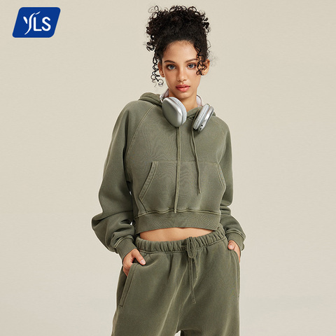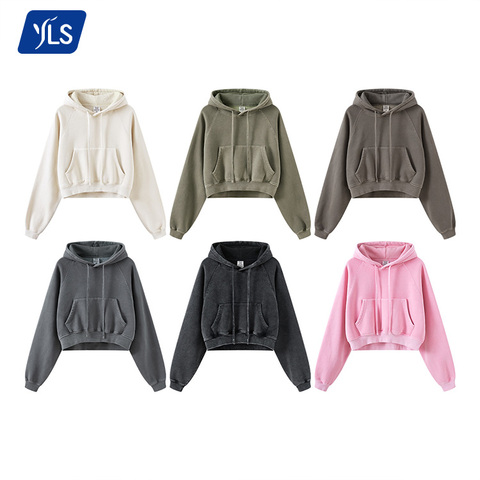 YLSD059 400GSM algodón Poly Fleece Crop Top Sudadera con capucha de alta calidad para mujer Sudadera con capucha lavada para Otoño Invierno
