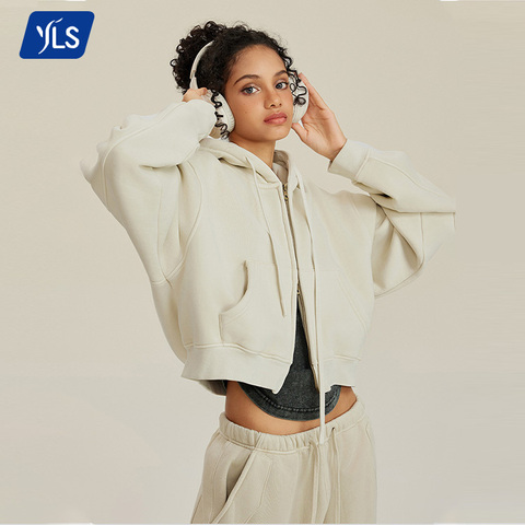 YLSD058 345GSM algodón Poly Fleece Zip Crop Hoodie mujer transpirable corto con capucha sudadera hombro caído